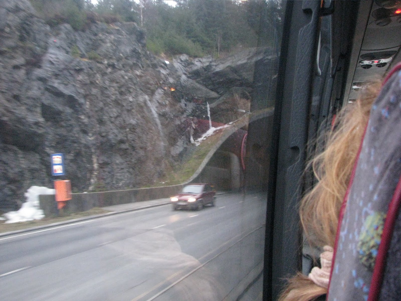 Continuam pe insula Stord pe E39 prin paduri albite si printre stanci golase. Intr-adevar ma simt in Norvegia trecand de pe o insula pe alta. In Leirvik soferul face o pauza de 10 minute si apoi trecem peste cele doua poduri imense (de peste 2 km fiecare) si tunelul de 8 km care coboara pana la 260m sub nivelul marii (mai jos decat cele despre care v-am povestit de cateva ori pana acum).