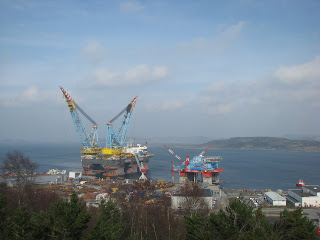 Cobor prin padure si ma indrept peste cateva zone cultivate spre Signalhaugen, varf impadurit si partial acoperit cu jnepeni aflat deasupra portului Mekjarvik. Urc printre jnepeni pe stancile tocite pana pe varf unde am ocazia sa vad "monstrul marin", platforma Saipen 7000 care isi intinde imensele brate ale macaralelor pana la 70-80 m deasupra nivelului marii. Mai fac cateva poze si cobor peste o treapta stancoasa care ma scoate la drum la inceput de tara plin de noroi si apoi asfaltat.