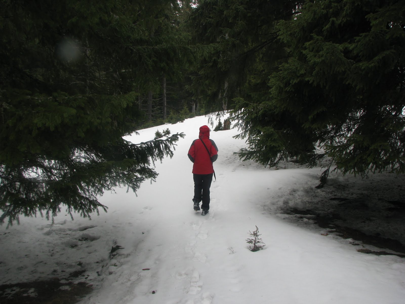 Iata-ne ajunsi in jurul orei 13.45 pe varful Santilia Mica de 1807m. Pierdem semnul in totalitate si ii spun Danei sa ma astepte putin ca vreau sa vad dc gasesc vreun semn mai jos in vale. Cobor putin si ma trezesc cu ea in spatele meu. Si semne absolut deloc!!! Ii zic sa mergem inapoi prin padure pana ajungem la ultimul semn. Intram amandoi in zapada pana la mijloc si inaintam destul de greu. Cand deodata dam de o banda rosie rasarita parca de nicaieri in mijlocul padurii! Hotaram sa urcam pe ea sa vedem unde duce. Speranta noastra era sa ajungem pe vf Leaota. Vise mari cand nu stii nici macar unde esti!!!