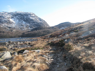 La ora 15.00 ajung la locul cu harta si imi reamintesc cu placere tura pe Bynuten in care am prevazut si iesirea actuala. Imi stabilesc in minte traseul si ma grabesc putin fiindca stiam ca am doar 4 ore pe munte fiindca ultimul autobuz inapoi e la 19.20. Pornesc pe drumul forestier Lysevegen (Drumul luminii) pana la lacul Blommetjørn.