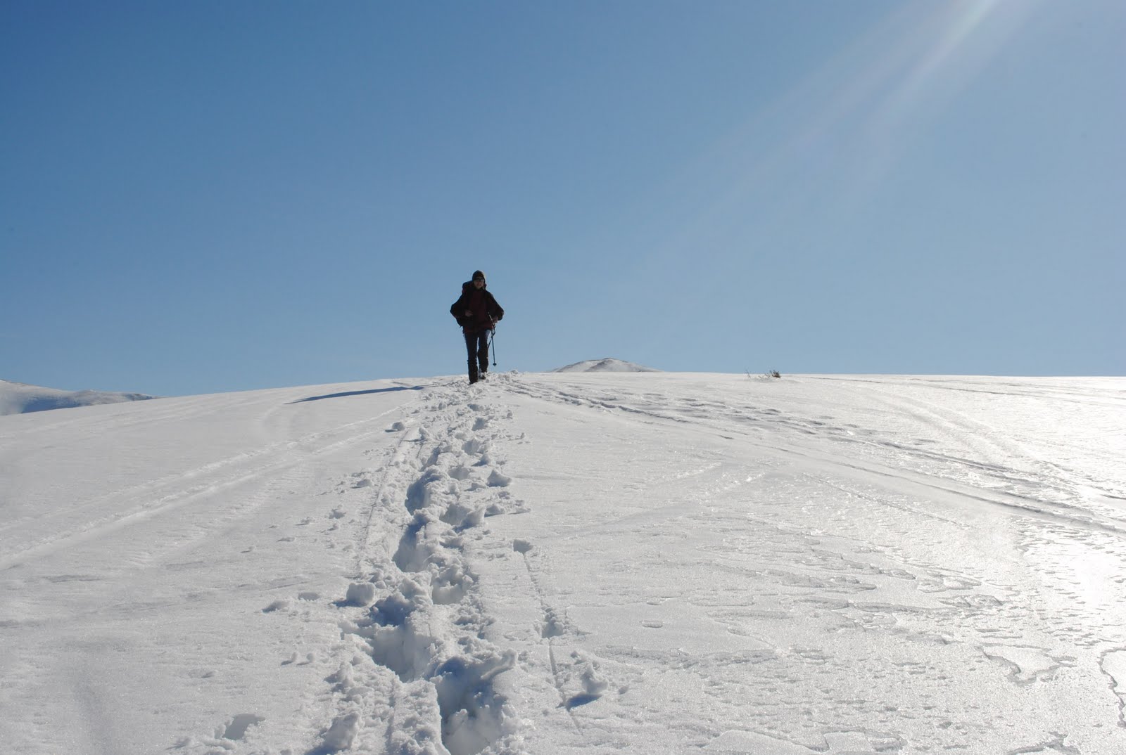 De fapt plaiul e o zona mai putin inclinata cu ceva petice de piatra si iarba. Ne croim poteca si ajungem la trecerea in urmatoarea vale. Eh, aici e si mai si! Ca sa mergem mai departe avem o singura solutie: sa sarim circa doi metri pe o mica platforma. Problema mea e ca sub noi e o alta vale inclinata pe care cu greu te poti opri. Ori daca se duce platforma de zapada, ne ducem si noi cu ea! Adina e iarasi mai curajoasa decat mine, isi lasa rucsacul, incearca cativa pasi in coborare si apoi sare pe acea platforma. Tine foarte bine zapada intarita! Adina ia rucsacul ei, apoi pe al meu si imi da si mie un pic de curaj. Degeaba ca "mosuletul" tot are retineri! Mereu ma gandesc ca e posibil pe aici sa ne intoarcem si caut mereu prize de intoarcere. Pana la urma imi iau si eu avant si sar. Vad ca de fapt nu a fost nici o problema si de sub perete se zaresc clar si niste prize pentru un posibil drum inapoi. Punem rucsacii in spate si mai departe pe creasta. Urcam iarasi spre linia principala a crestei si ocolind micul fir de vale, vedem in stanga o brana ce urca spre un mic platou un pic mai ridicat. Cativa pasi cu atentie pe brana si suntem sub linia platoului. Folosim o creanga solida ca sa urcam vreo doi metri si apoi pe sub varful albit de zapada ajungem in alta sa din care vedem drumul nostru in continuare. E momentul pentru o mica pauza de observare a muntilor din jurul nostru si a frumoaselor cornise ce se apleaca in special spre nord. In est vedem Cozia din alt unghi decat cele de mai devreme si departe in nord vedem inzapezitii munti ai Lotrului cu varful Sterpu mai proeminent. Aici am dormit nu demult in "Circuitul Lotrioarei" organizat de domnul Dinu.
