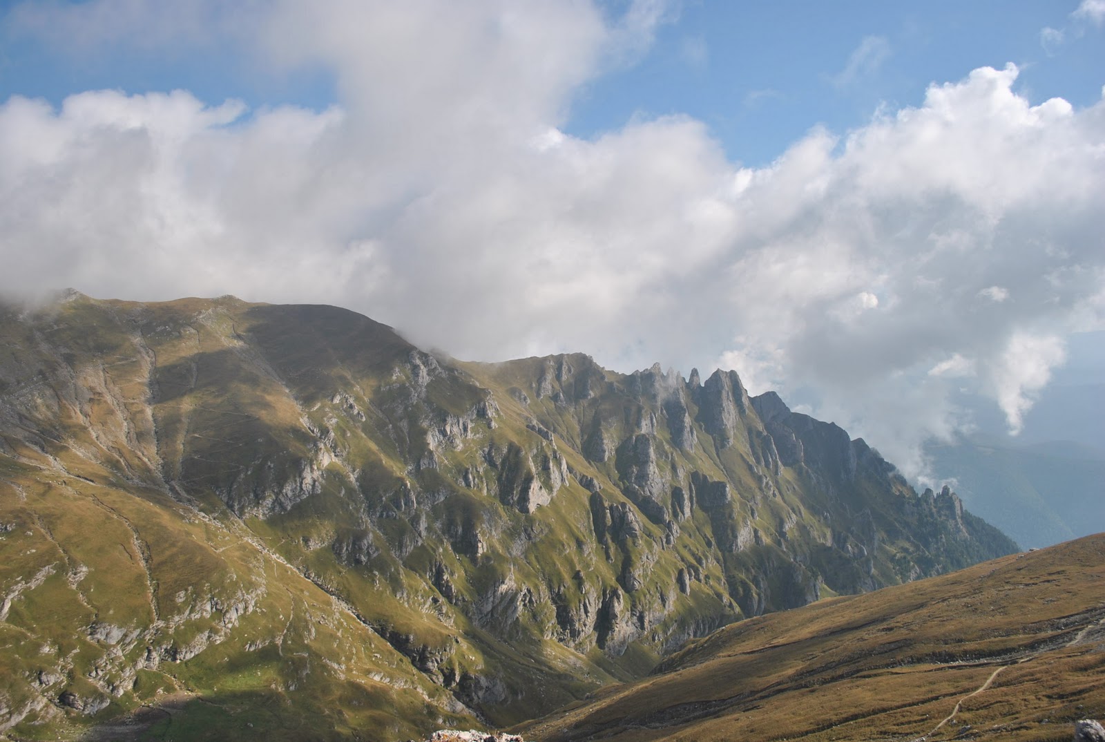 In spate lasam pe moment varful Obarsia si saua noastra, in stanga avem Valea obarsiei si stancoasa muchie a Doamnelor si in dreapta muntele Costila in spatele vaii Sugarilor. "Racheta montana" - releul de pe Costila, cladirea situata in varf la cea mai inalta altitudine din Romania, e mangaiata de pete de nori si ferestre de lumina.