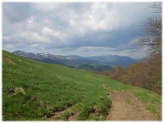 De acum începe noul pentru mine! Știu cam care este direcția și pe lângă jnepenii din dreapta văd o potecuță firavă ce pare să meargă spre Ulita. Intru un pic pe ea și găsesc marcajele! Iupiii! Pe lângă BG mai este și o BA orizontală care înconjoară copacii! Îi spun lui Emil că am găsit semnele și începem o coborâre abruptă prin pădure. În câteva serpentine pierdem niște zeci de metri până la circa 1200 de metri. Facem o mică pauză de respiro și pornim mai departe pe culme. Poteca ne duce prin pădurea de fag pe partea dreaptă a culmii, pierdem marcajele (care probabil urcă direct pe culmea golașă), trecem pe lângă niște limbi vechi de zăpadă și văd în față sus pe vârf un stâlp. Clar , acolo e Ulita! ”Hai să tăiem panta și urcăm spre culme și vârf!” Fiecare în ritmul lui și pe poteca lui ajunge pe linia culmii (marcată cu bețe de circa 80 de cm cu vârful vopsit în roșu - rămase de la ultramaraton ca și benzile de plastic uneori de mare ajutor în orientare!) și apoi pe vârf! Uf, abia pe Ulita am ajuns! Și cât mai avem... Eu am satisfacția reușitei până aici și din păcate Emil nu știu cât simte asta din cauza durerilor din călcâi! Tot mă întreabă cât mai mergem... Uite vârful mare și după el undeva punem cortul. Unde ajungem pe seară! Mă uit spre culmea Radila pe unde fusesem în octombrie 2010 cu o prietenă în altă parcurgere a crestei Grohotișului! După ce ne odihnim puțin plecăm spre zona vârfului Grohotiș pe drumul de culme.