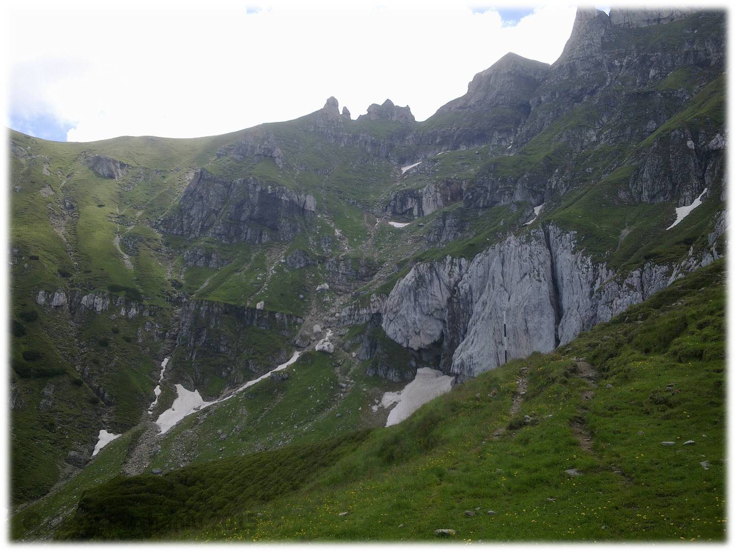 Pe marcaj coborâm în adâncul căldării și eu aș renunța la peșterile din căldarea Ciubotei. Citisem despre ele și despre zona calcaroasă de mai devreme în articolul de pe site-ul România Natura... Așa cum intuisem și mai devreme (chiar de la băieții cu cortul de mai sus de refugiul Țigănești), intrările în peșteri se află deasupra unei limbi de gheață. Eu am un pic rețineri la rimaye și la mersul pe gheață, mai ales că nu avem colțari la noi... Ana Maria mă impulsionează: