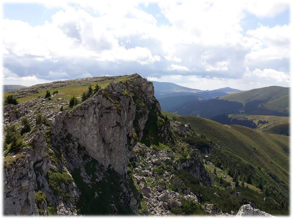 Trecem de jnepenii de pe Guțanu, ne intersectăm cu niște alergători foarte tineri, facem o pauză după marcajul PR de pe culmea Doamnele și urcăm susținut pe muntele Doamnele. Recunosc, cam trag de Ioana la urcare fiindcă știu că mai avem ceva de mers azi. Coborârea spre obârșia Văii Obârșiei ne va da momente de relaxare. Pe stânga se vede imensa vale Gaura, pe dreapta Obârșia cu Mecetul Turcesc. Abia acum Ioana vede clar pe unde a coborât acum câteva zile! Mergem pe sub calcarele vârfului Găvanele (2472m) și urcăm în șaua dintre acesta și vârful Ocolit (2503m). Chiar un grup cu un câine micuț ne întrebase de poteca de coborâre spre Babele! Aici doi bicicliști ne întreabă de traseul spre Doamnele și indicațiile sunt foarte simple: banda roșie! Nu mai urcăm pe Ocolit fiindcă Ioana fusese pe ceață în prima zi și mergem pe curba de nivel până după vârf și apoi urcăm la cabana Omu.