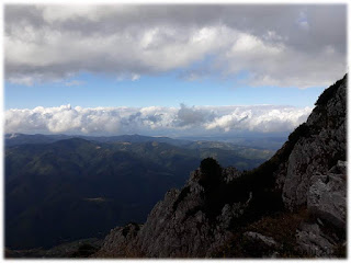 Remarcarea merge bine cu toată ceața. Facem o pauză scurtă la vârful Padina Popii (primul vârf peste 2000 de metri!) și continuăm spre Ascuțit. Pe sub niște muchii ascuțite întâlnim echipa care vine în direcția opusă față de a noastră. Și un grup destul de numeros care ne spun de colegii noștri și ne admiră munca. Este doar parte din a fi Om de Munte! Fac o scurtă paranteză: ”montaniard” sau ”montagnard” înseamnă ”om care trăiește la Munte”. E adevărat că o parte bună din timp și noi trăim pe Munte (pe Munte sunt multe momente în care simți că trăiești!), dar nu am putea fi numiți montaniarzi în sensul original al cuvântului! Încheiem cu bucurie partea noastră de traseu și facem o pauză la refugiul Ascuțit pentru regrupare.