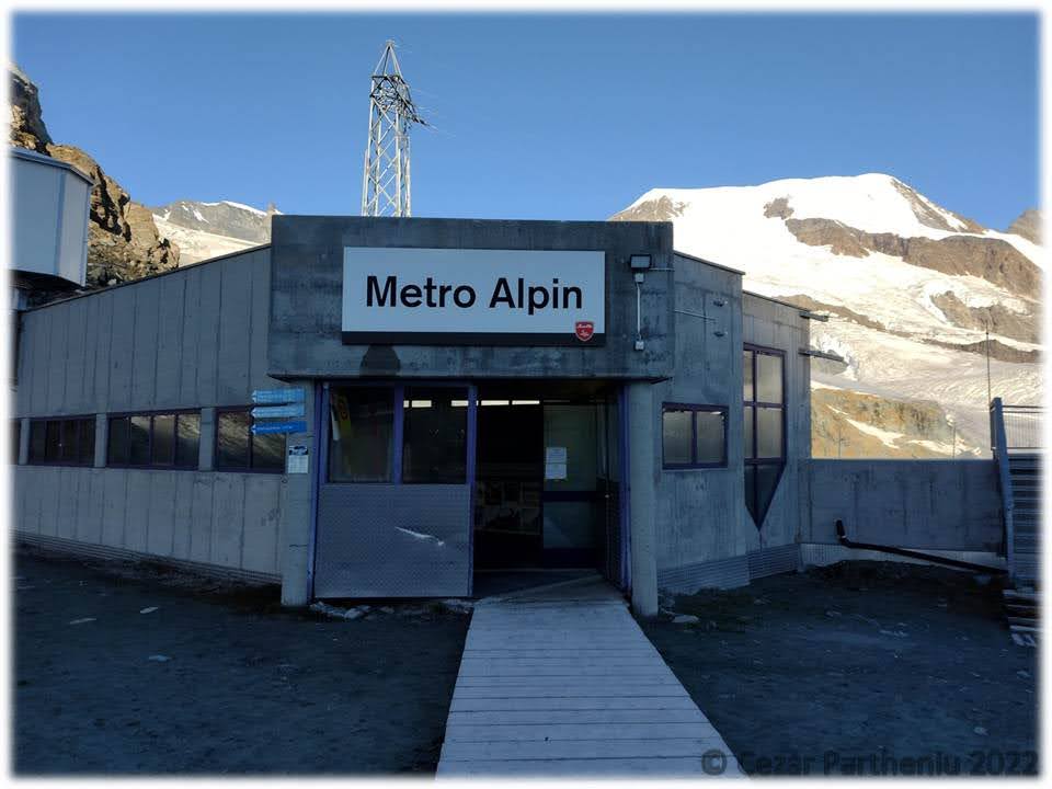 Telecabina ne duce la 3000 de metri și aici doar facem ceva poze în mers la ghețarii de deasupra noastră sau la micile amenajări înainte de a intra în tunelul către Metro Alpin. Mergem până la mijlocul tunelului, facem stânga și apoi dreapta la casă. Ne costă 100 EUR/CHF un drum dus-întors de fiecare. Este mult (este normal într-un fel să aibă prețurile astea știind că iese profit bun, Allalinhorn fiind cel mai ușor vârf de 4000 de metri și vin destul de mulți!). Metroul (de fapt un vagon mai lung pe cremalieră) urcă în pantă prin tunel, până la 3500 de metri latitudine. Aici este restaurantul rotativ, o terasă panoramică și multe amenajări tehnice. Suntem deasupra limbilor ghețarilor și începe fascinația lumii albe/lumii de sus. Se văd limbi ale ghețarilor cu multe crevase în ele: Hochlaubgletcher este cel mai impunător, cum ieșim din complexul tehnic, pe partea stângă. În față avem creasta Hinter Allalingrat și în dreapta una din limbile marelui ghețar Feegletcher. Pe el sunt crevase mari și se fac lucrări de amenajare a acestuia (posibile pârtii?). De fapt și noi vom porni pe drumul făcut de ratrack-uri, undeva pe dreapta crestei Allalingrat. De menționat că lucrările acestea se fac după o foarte atentă analiză a ghețarului. La fel se deschid și rutele spre fiecare vârf la începutul sezonului. Asta o fac cei mai buni ghizi care estimează cel mai bine situația în fiecare an. Fiindcă ghețarii sunt activi și își schimbă structura permanent! Se pot acoperi crevase, pot apărea unele noi, se pot rupe sau se pot forma noi poduri de gheață. În fine, sunt multe detalii pe care nu le cunosc și care mă determină să am încredere în cei mai buni ca mine. Întotdeauna este cel mai bine să îți cunoști nivelul, să îți cunoști organismul, să te avânți (nu e cel mai bun cuvânt fiindcă totul trebuie să fie extrem de calculat!) doar în locurile unde știi că poți face față fizic. Și nu este nici o rușine să te oprești atunci când simți, nu că ți-ai depășit limitele fiindcă asta facem mereu, ci că ai ajuns la limita ta fizică. Și să recunoști și să ai încredere în cel care este mai bun ca tine., fără a-l supraevalua și pe el. E adevărat că cei cu un nivel mai scăzut întotdeauna vor comenta și te vor judeca. Și cei buni te vor aprecia pentru ce ai reușit să faci. Se spune că ”Cei mai buni alpiniști sunt cei în viață” (Reinhold Messner). După cum spuneam, pornim în urcare ușoară pe urma de ratrack și abia unde se termină aceastea ne vom echipa pentru a merge legați în coardă. Siguranța înainte de toate!!!